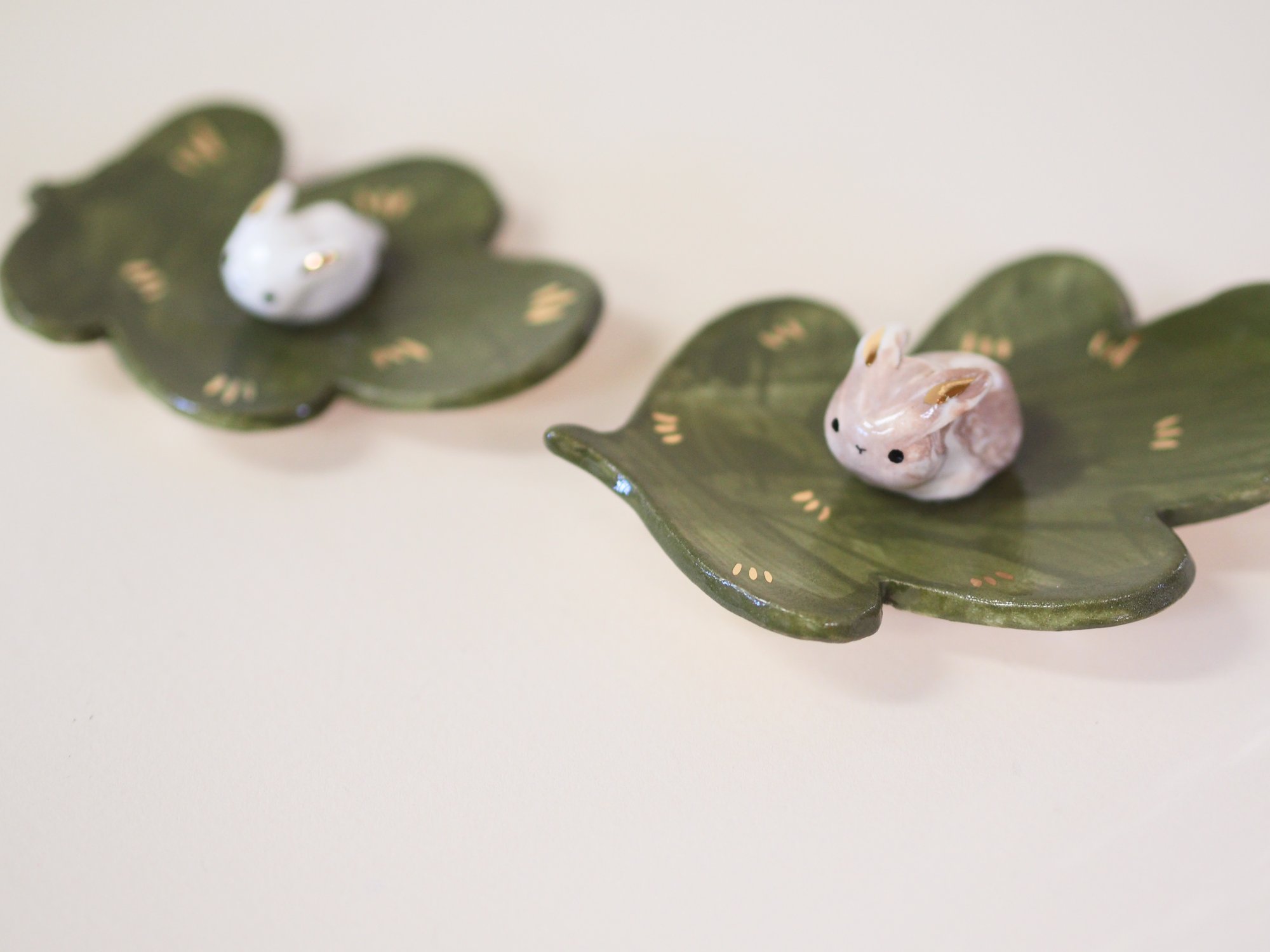 Green oak leaf ring dish each with gold luster details and a little bunny at the center. Choose one below.