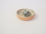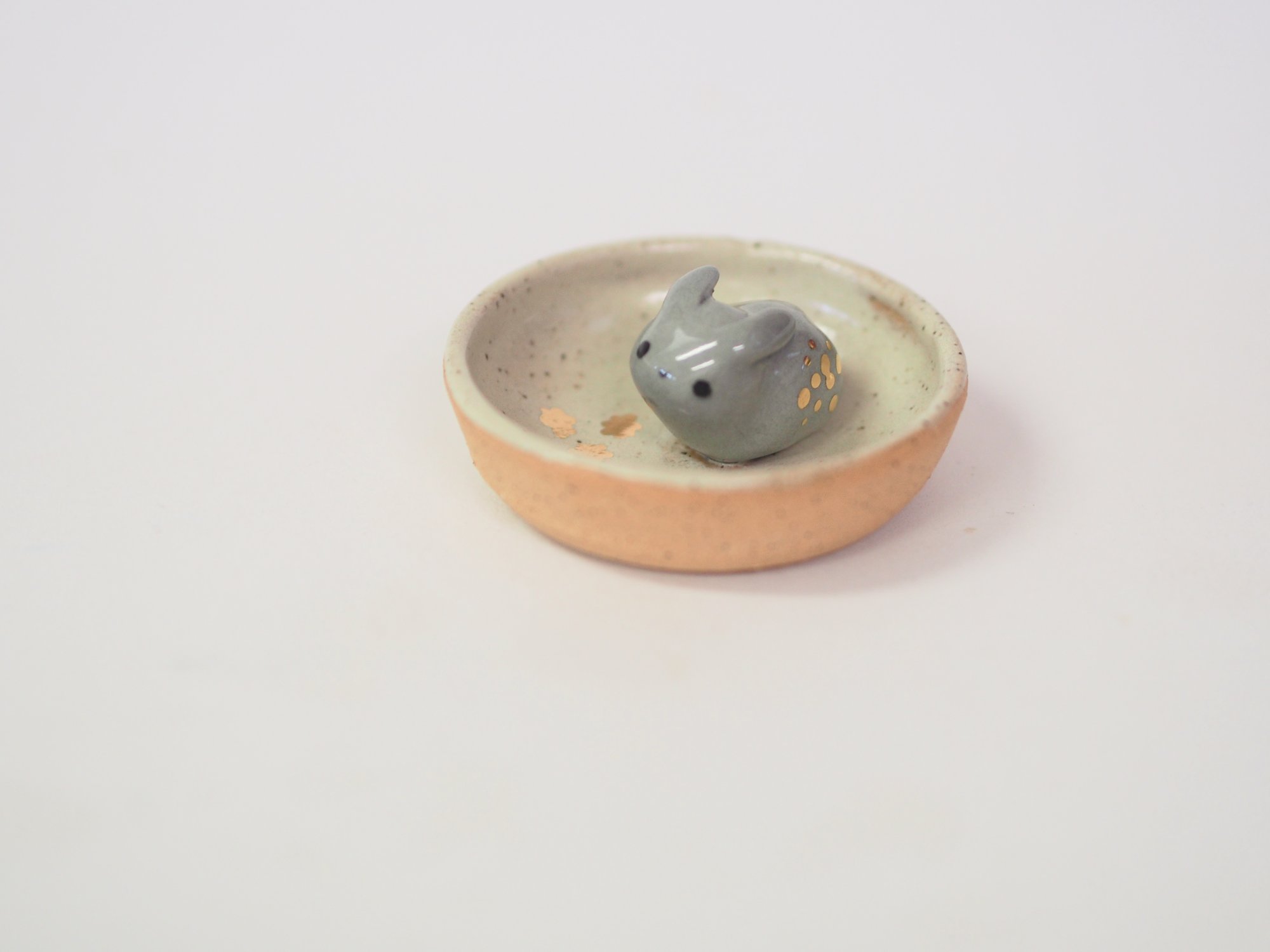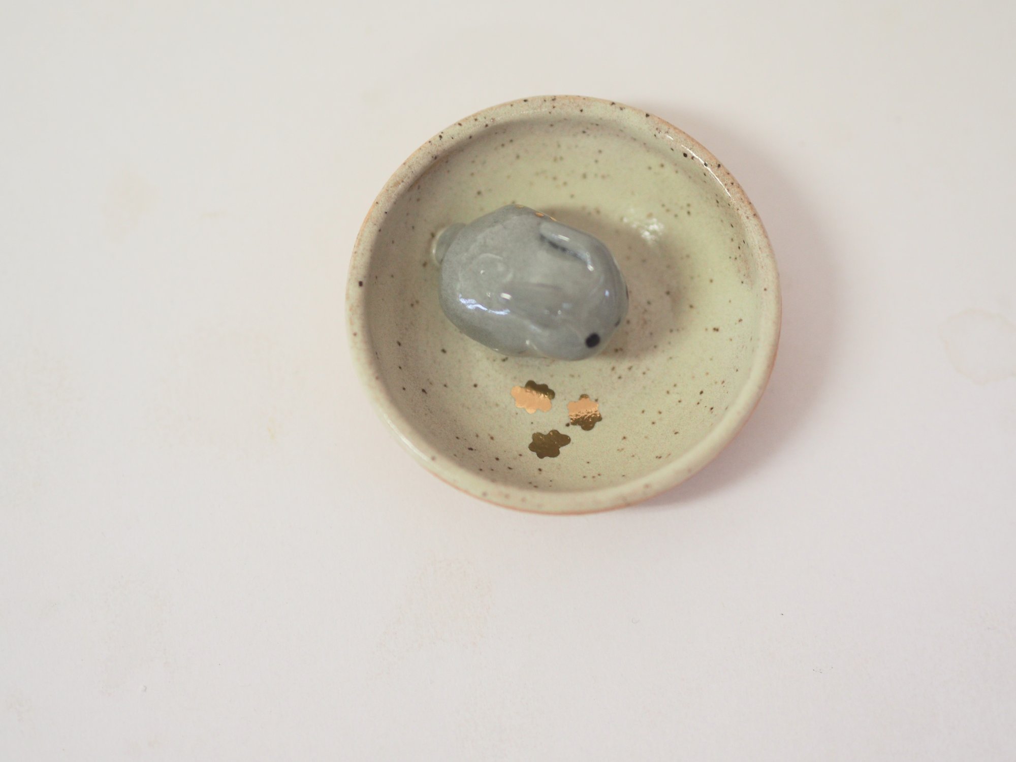 Tiny white jewelry dish with a grey bunny in the middle and gold luster details.