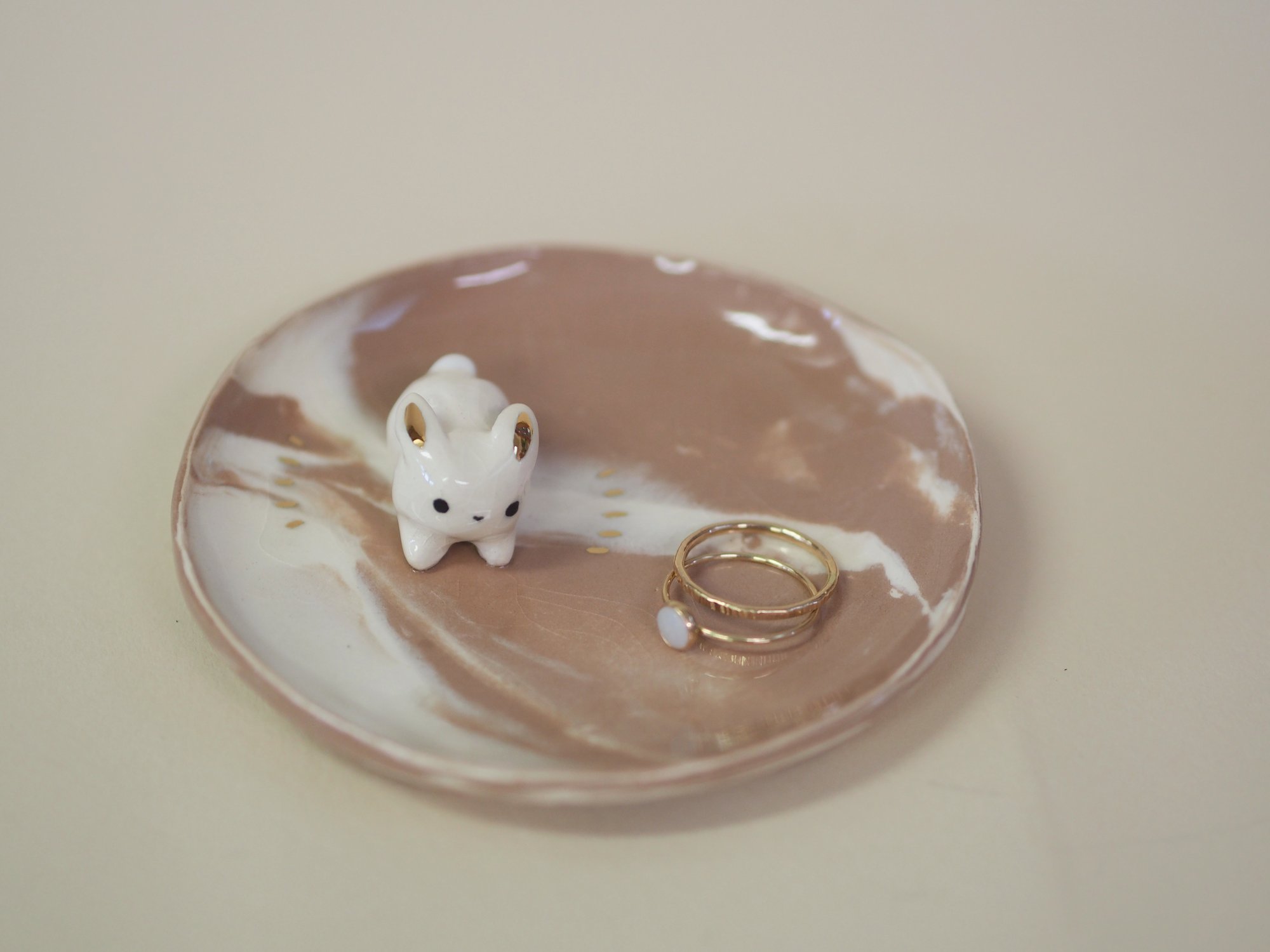 Swirled porcelain ring dish with a white bunny and gold luster.