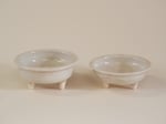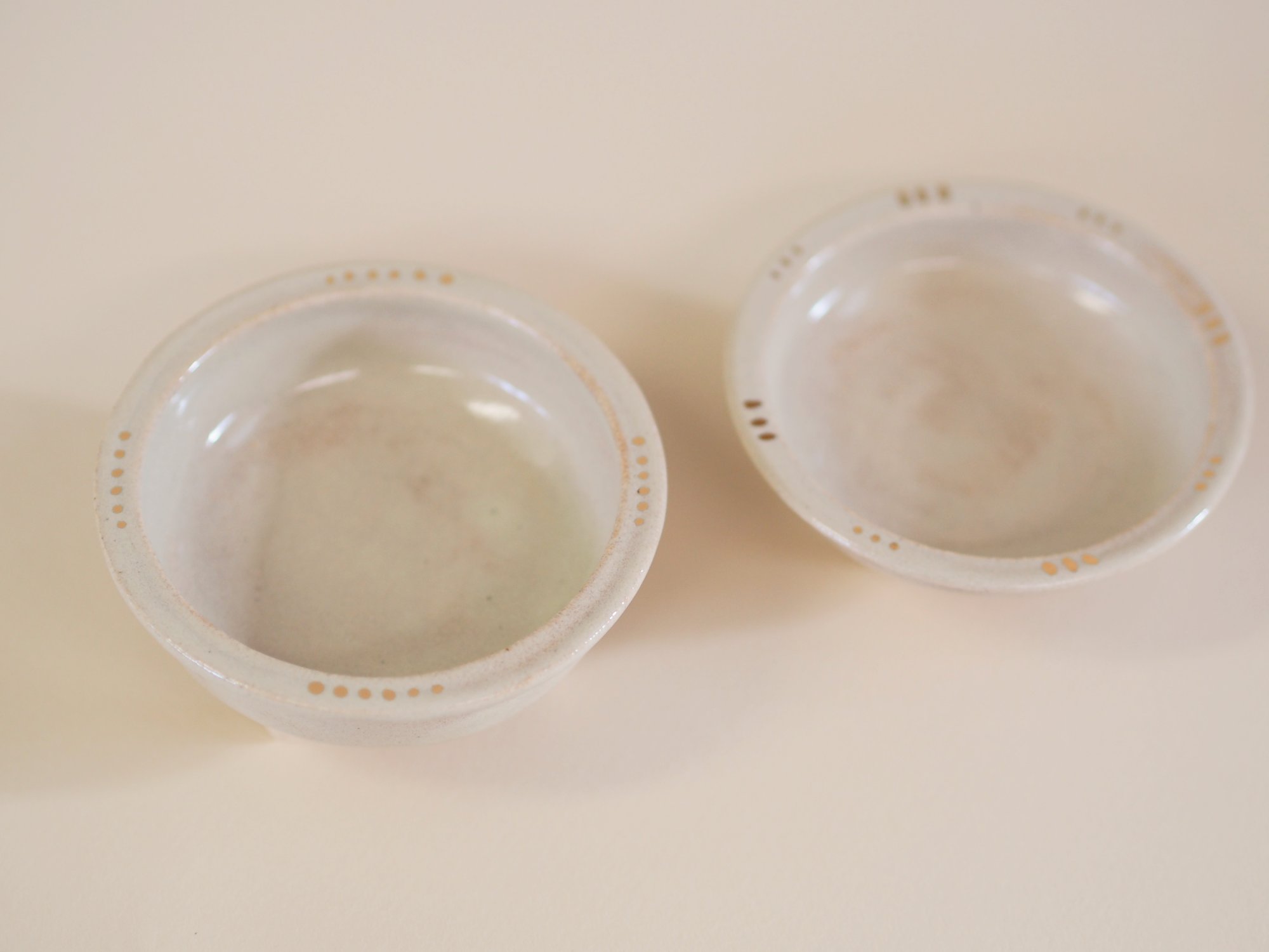 Cream glazed ring dishes with little feet and gold luster details. Choose one below.