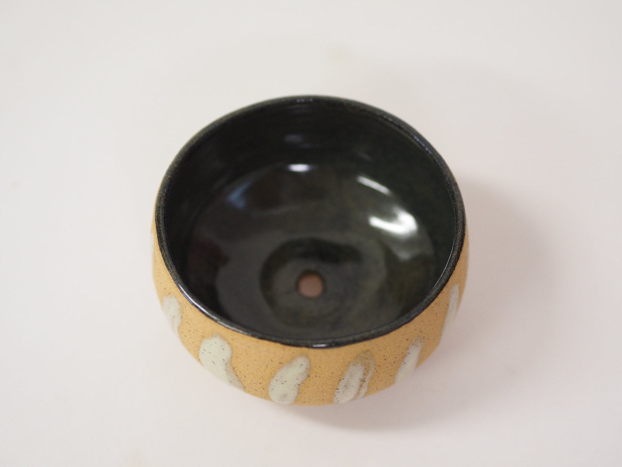 Small speckled planter with a single drainage hole in the middle and three little feet to stand on.