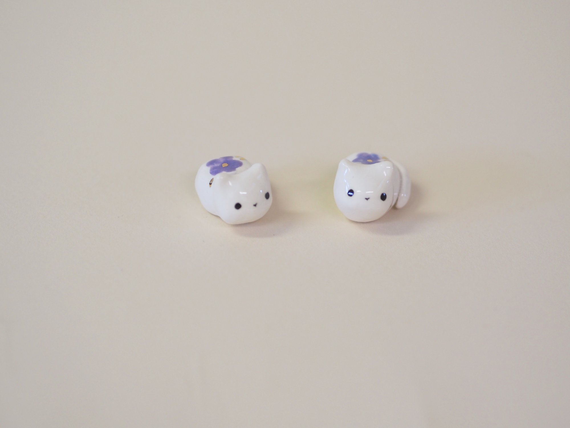 White porcelain kitties each with a purple flower on their backs and gold details. Choose one below.