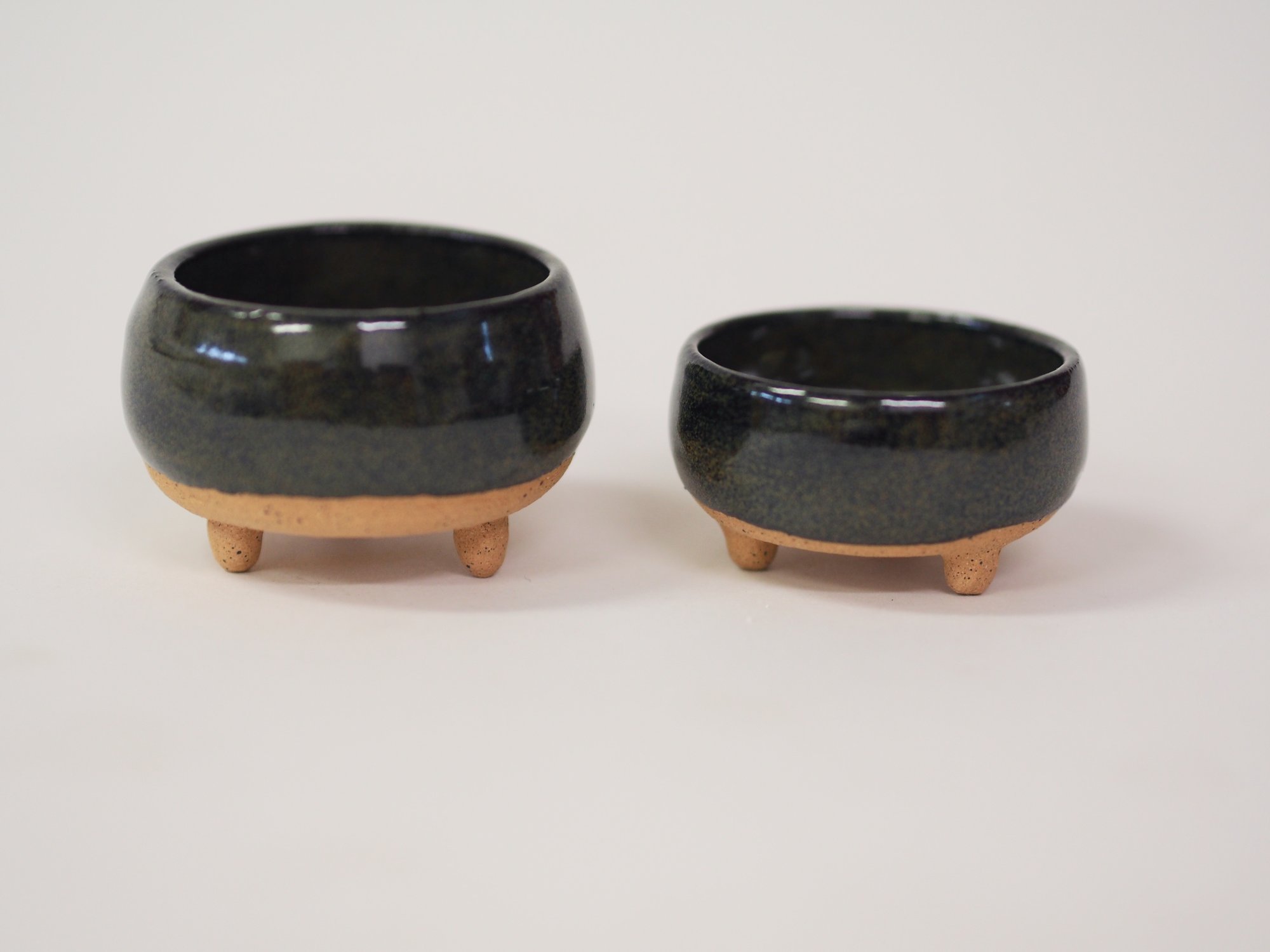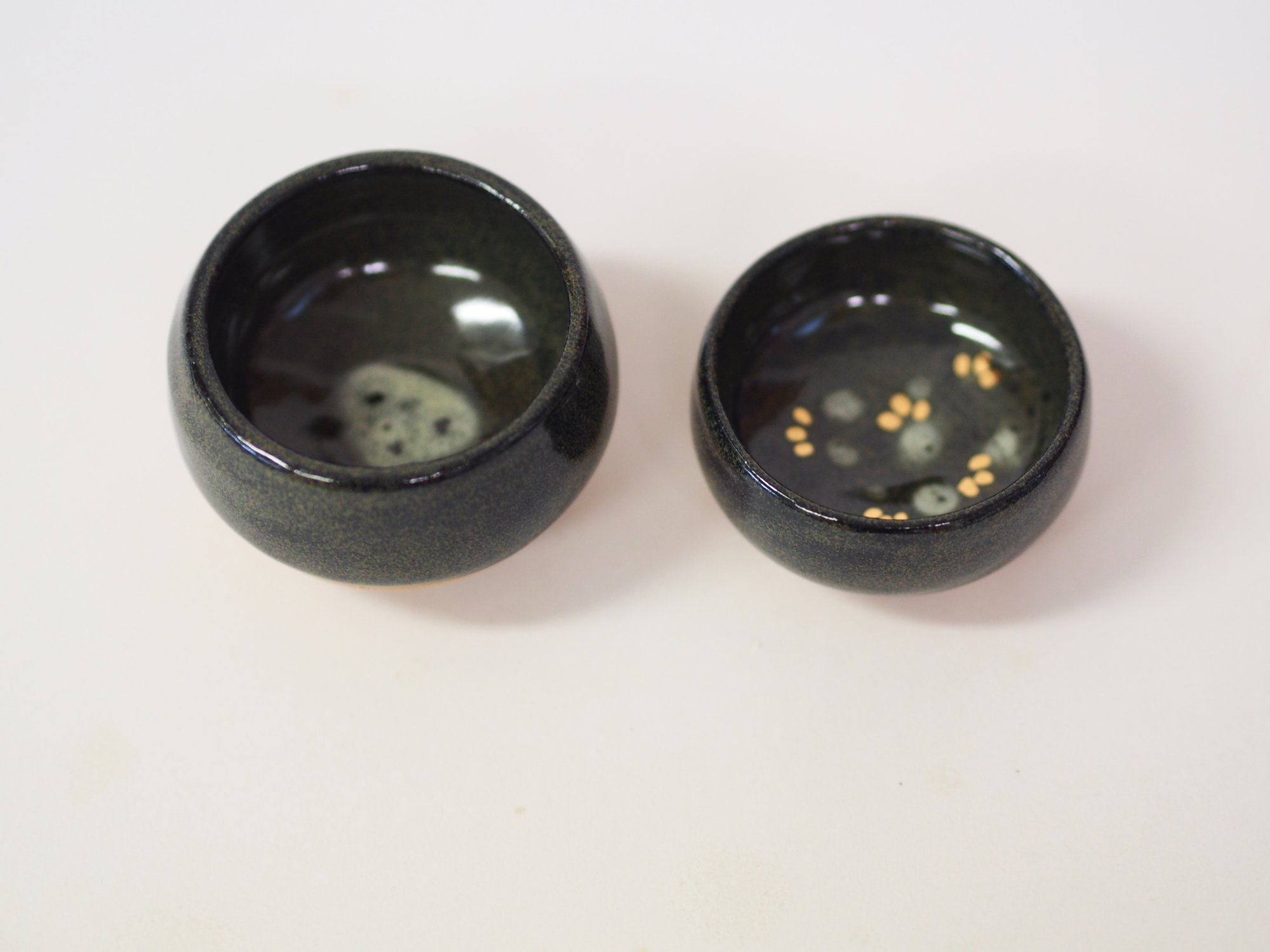 Small footed bowls with dark glaze and gold luster on the inside. Choose one below.