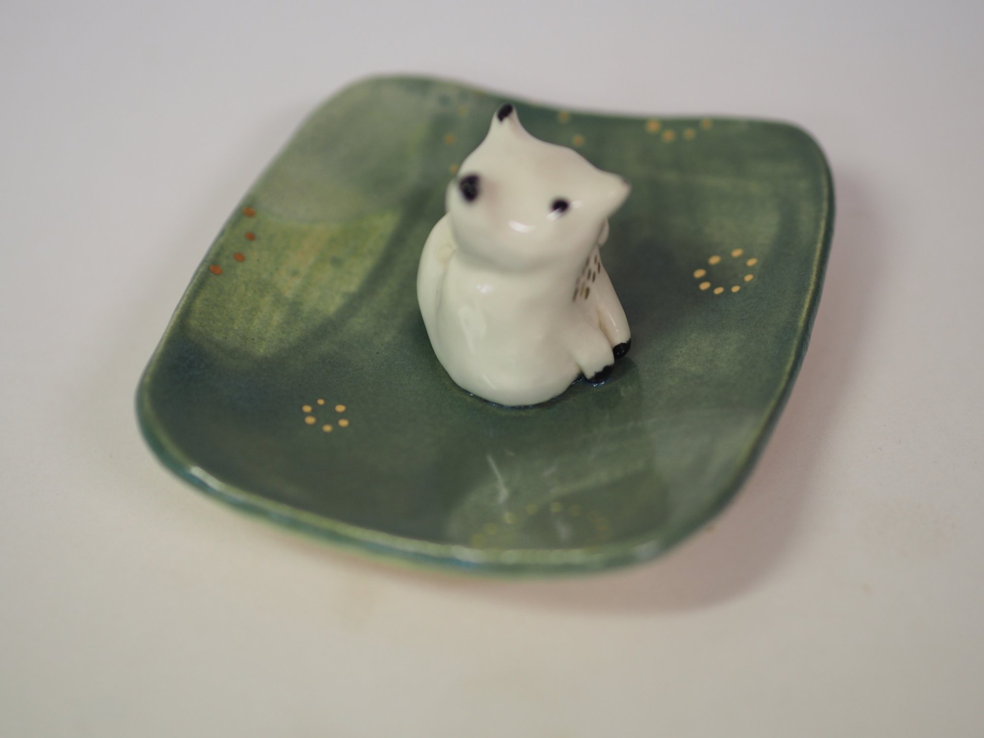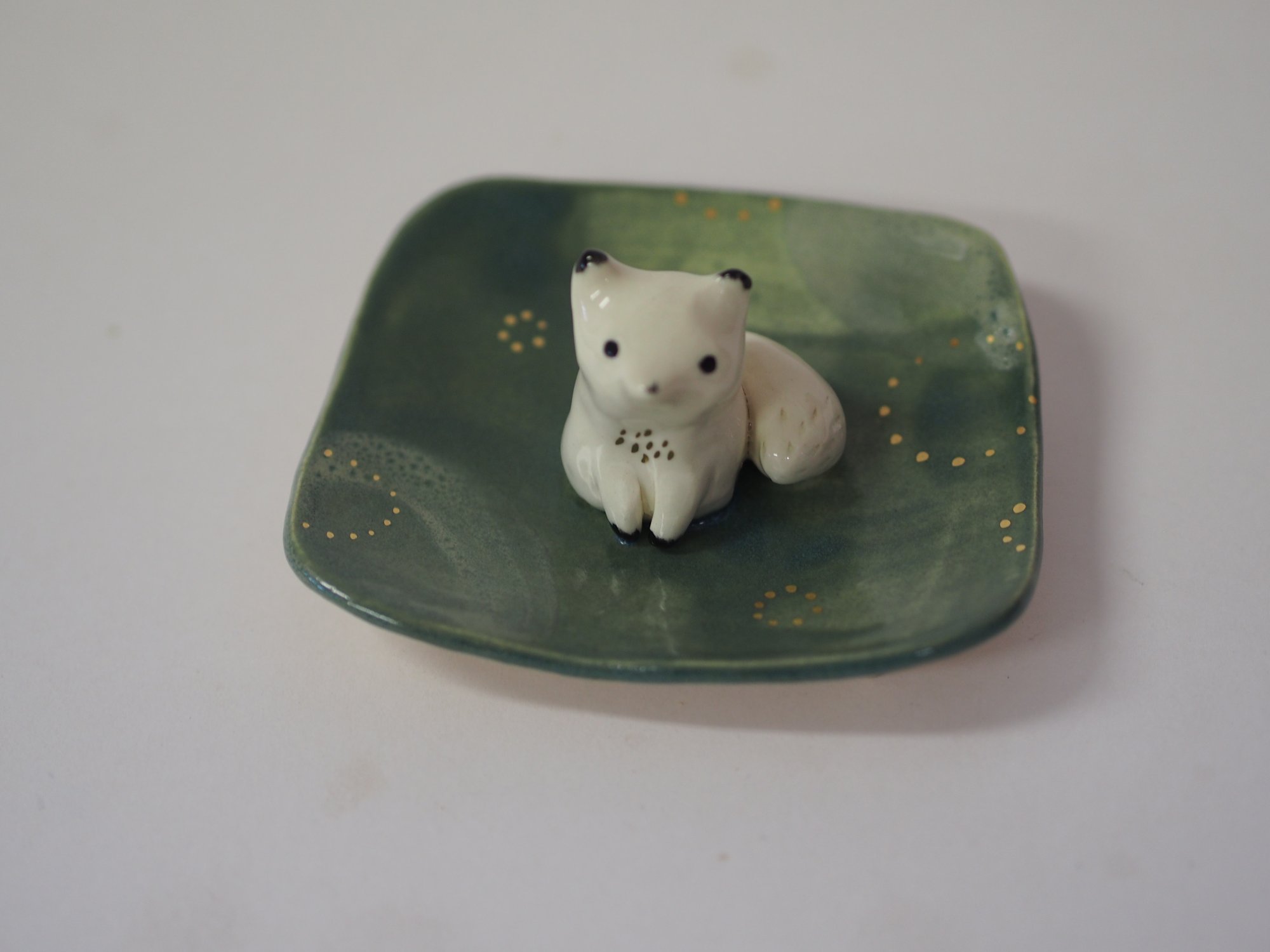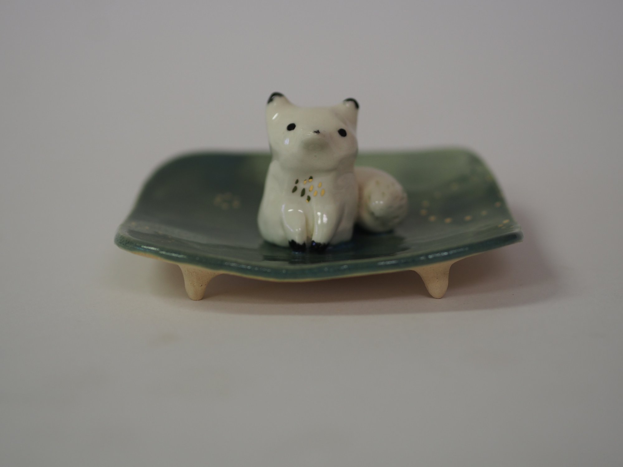 White porcelain fox on a green and white dish with feet. Perfect for jewelry or small treasures.