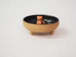Footed dish with a fox inside and gold luster details.