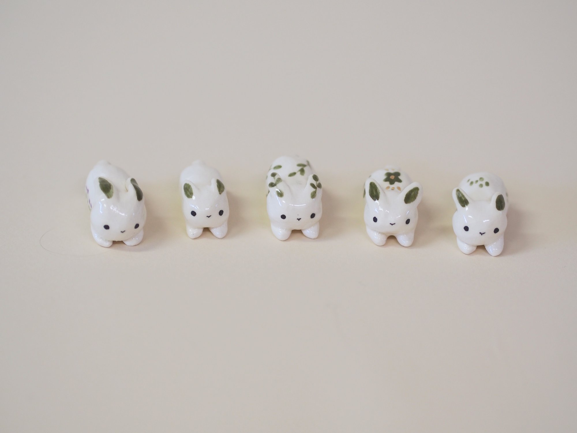 White porcelain bunnies with green underglaze. Choose one below.
