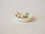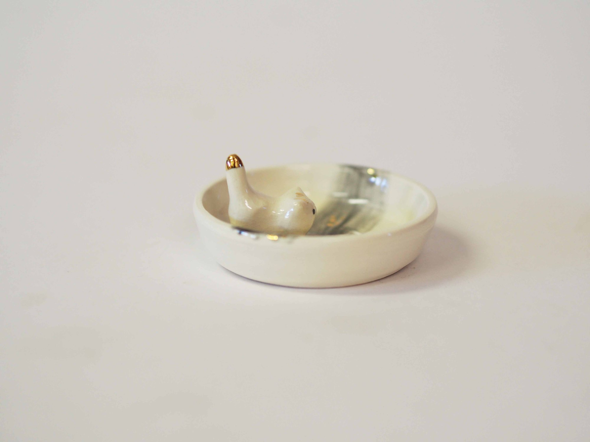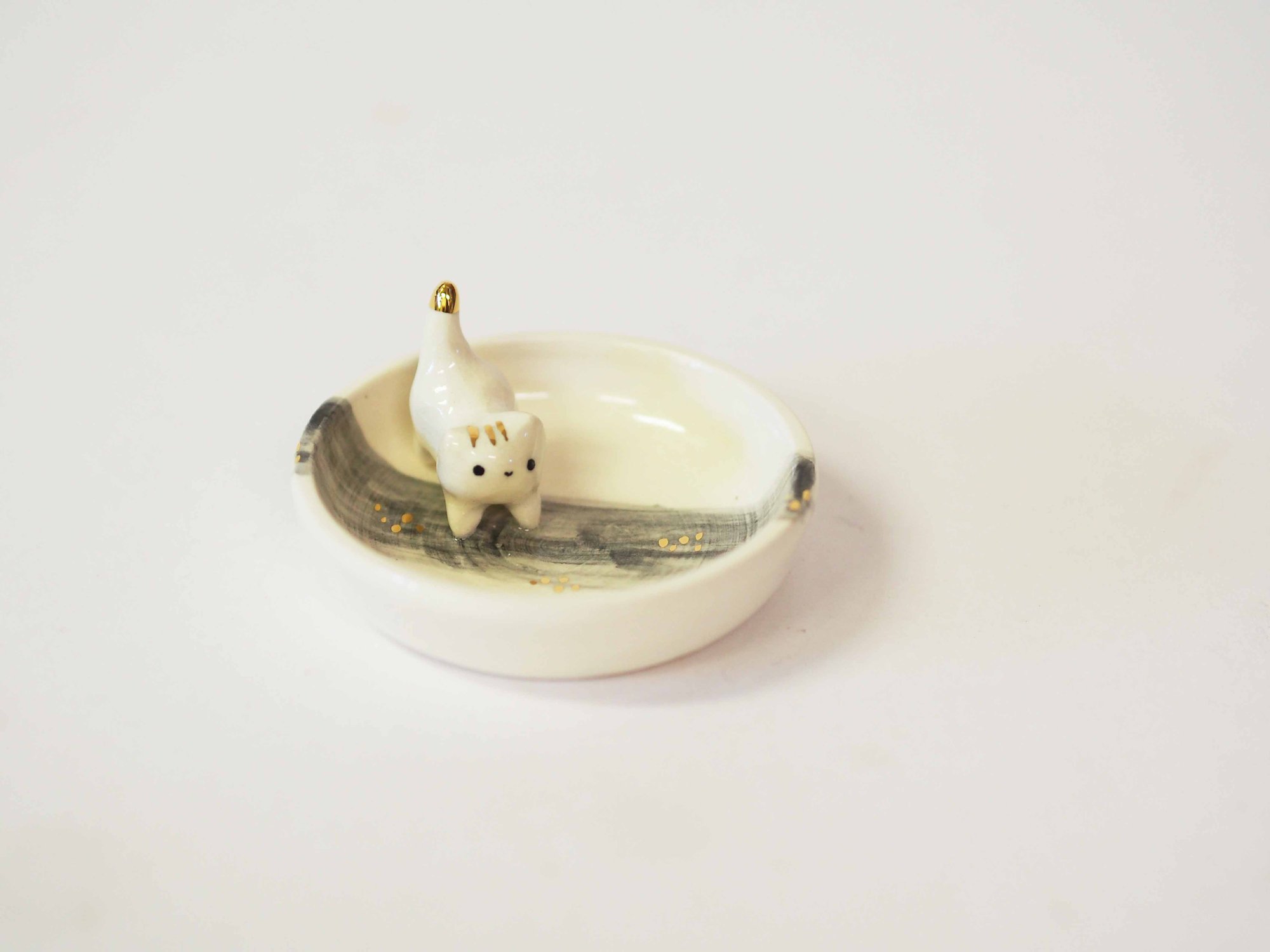 Standing kitten in a little porcelain ring dish, gold luster details.
