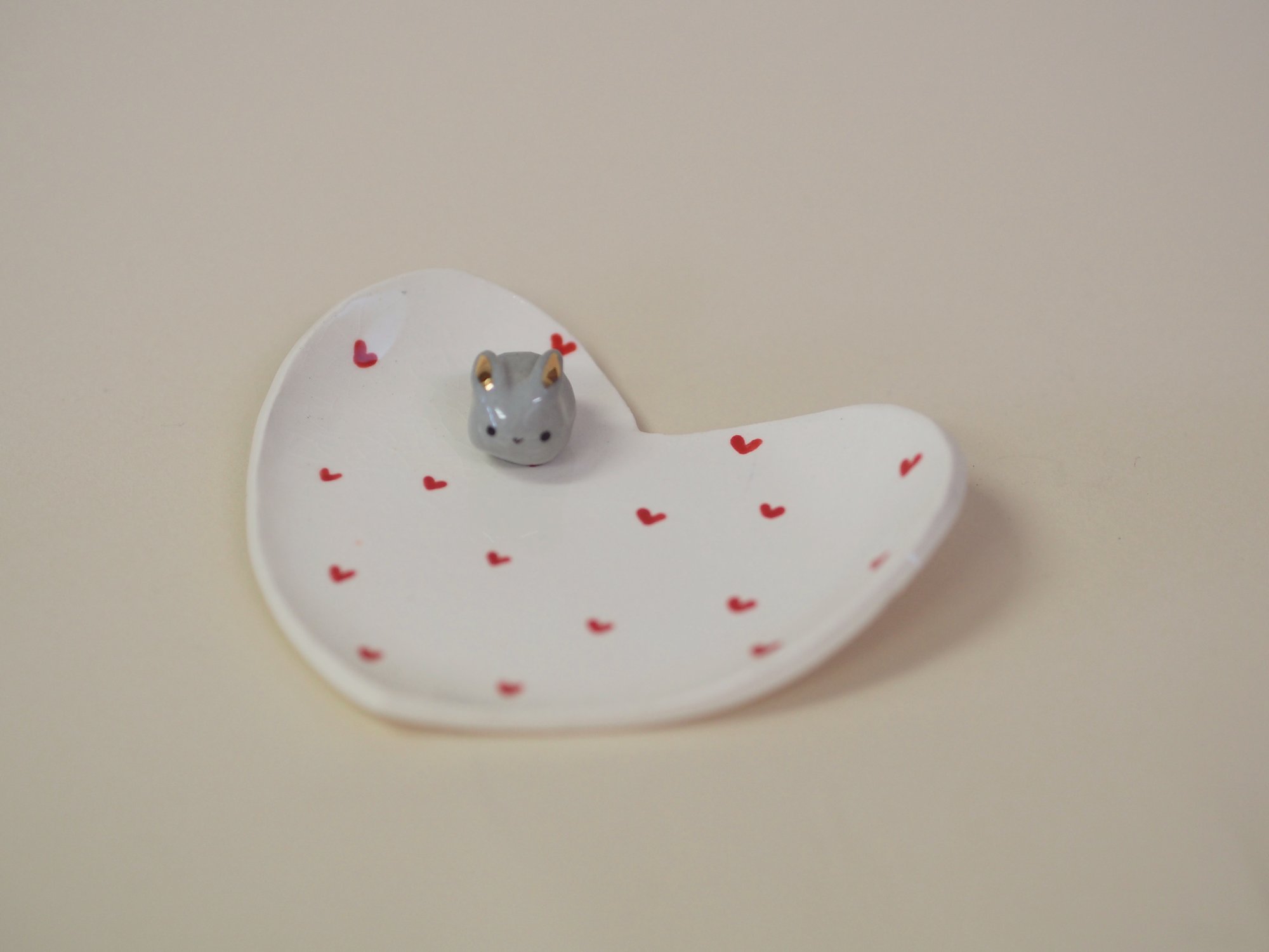 Porcelain ring dish with a grey bunny and gold luster details. Rings not included.