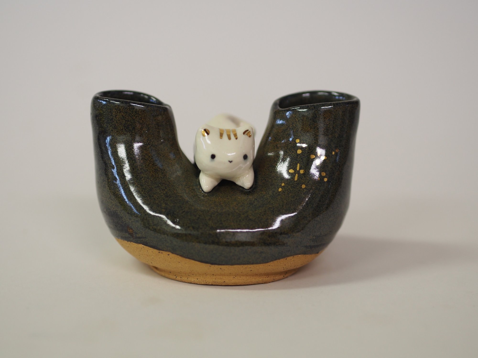 Double vase with a kitty in the middle and gold luster details. The eyes on the kitten ran just a tad in the kiln.