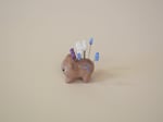 Brown bear with a purple heart, two white clouds, and three blue stars.