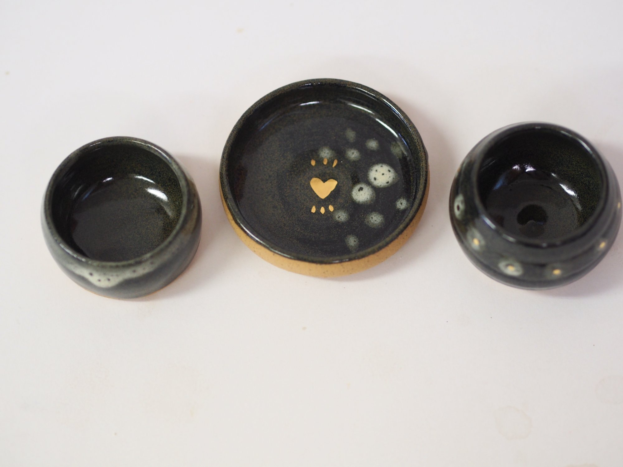 Dark glazed bowls and dish with white glaze details. Choose one below.