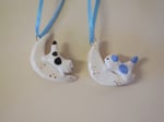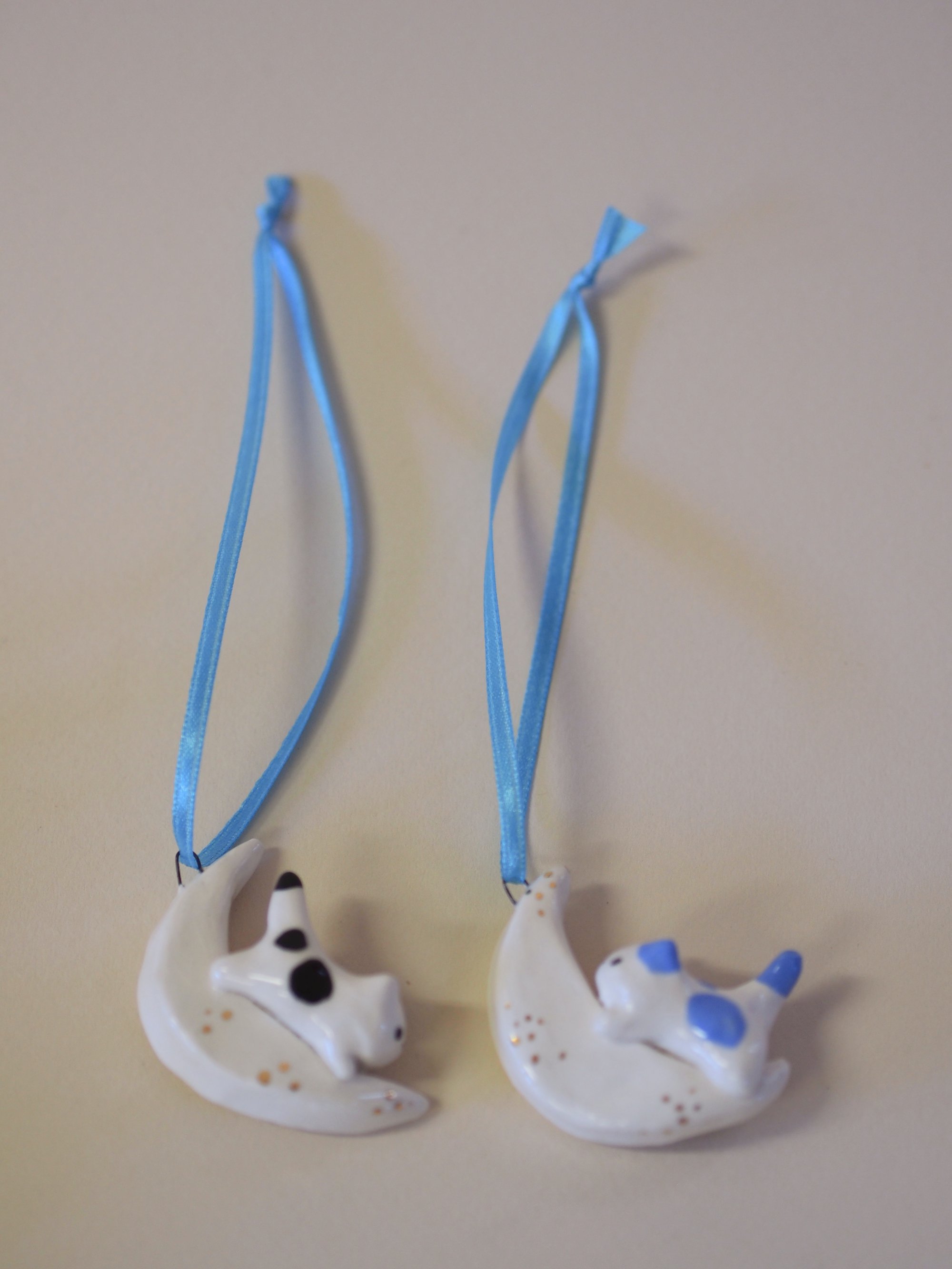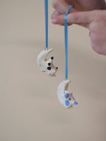Playful kittens climbing around the moon, each with gold luster details. Hang on your wall, or a jewelry tree, near your spices, etc. Choose one below.