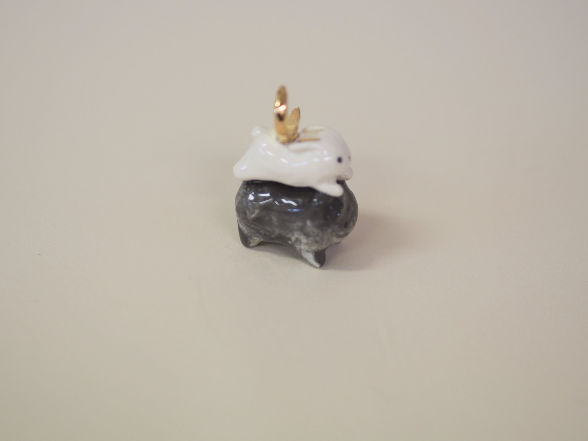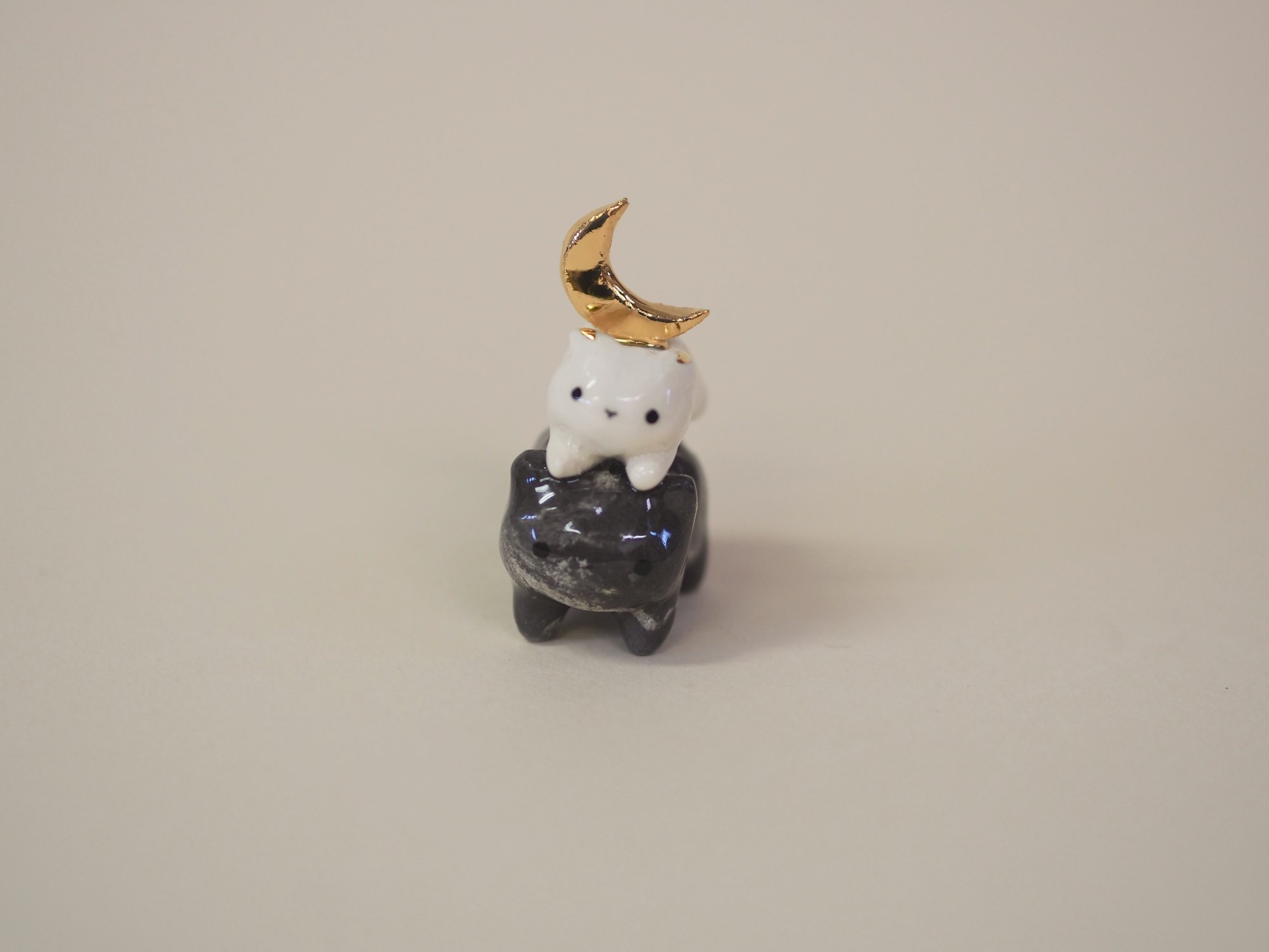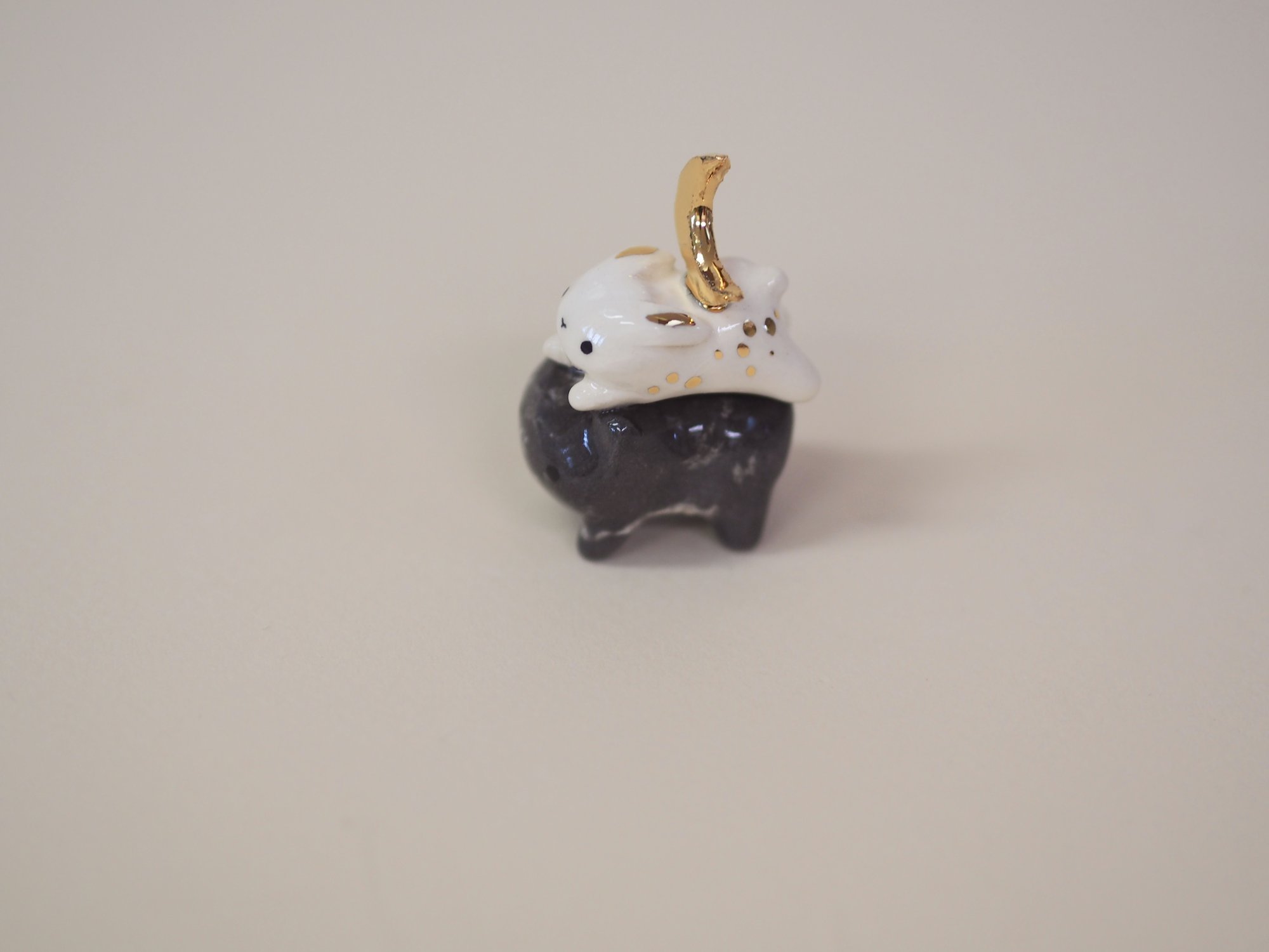 Swirled bear with a white porcelain bunny on its bak and a golden moon on top of that.