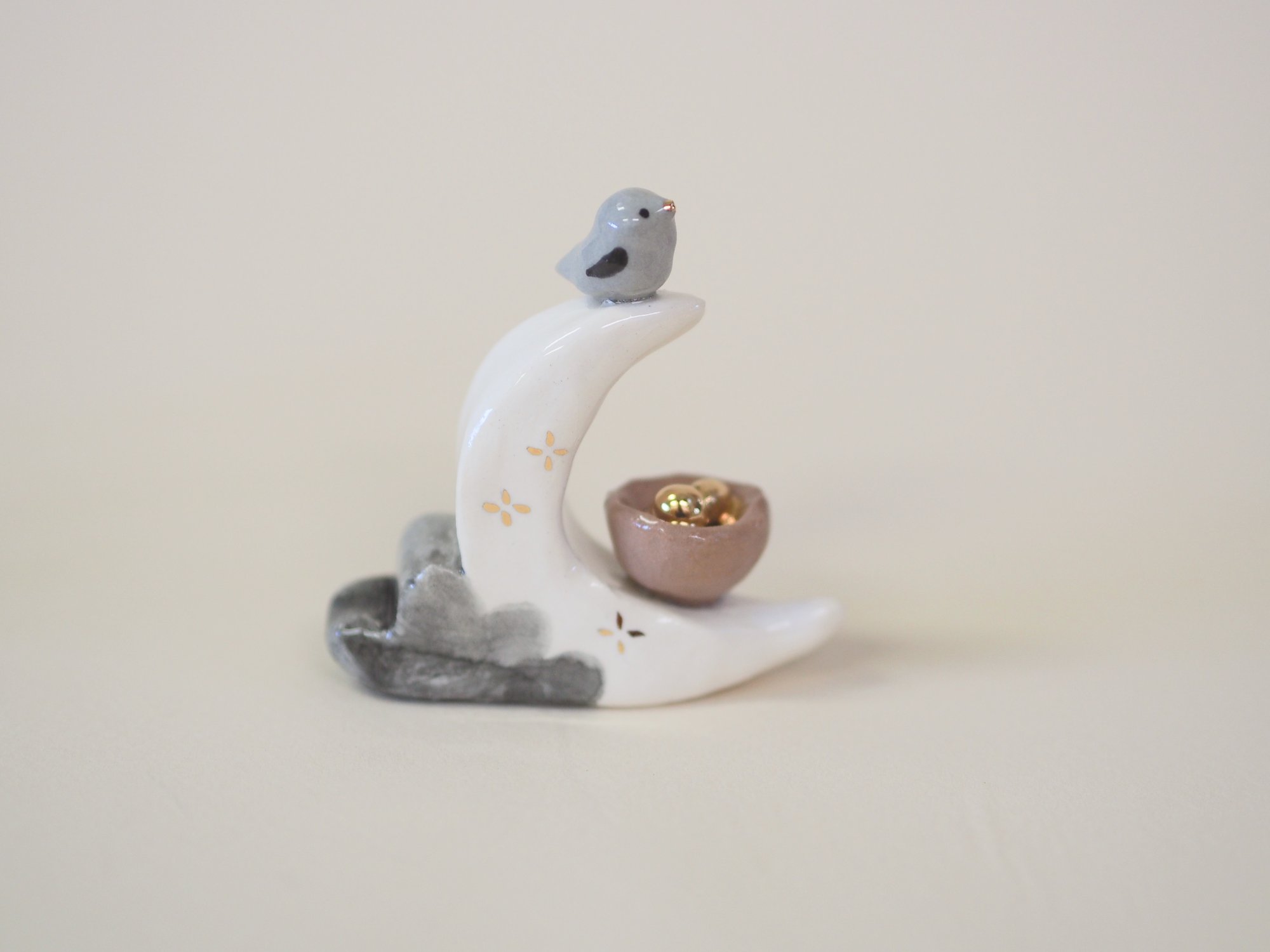 White crescent moon with a bird perched on top! Gold luster eggs in the nest and dark underglaze.