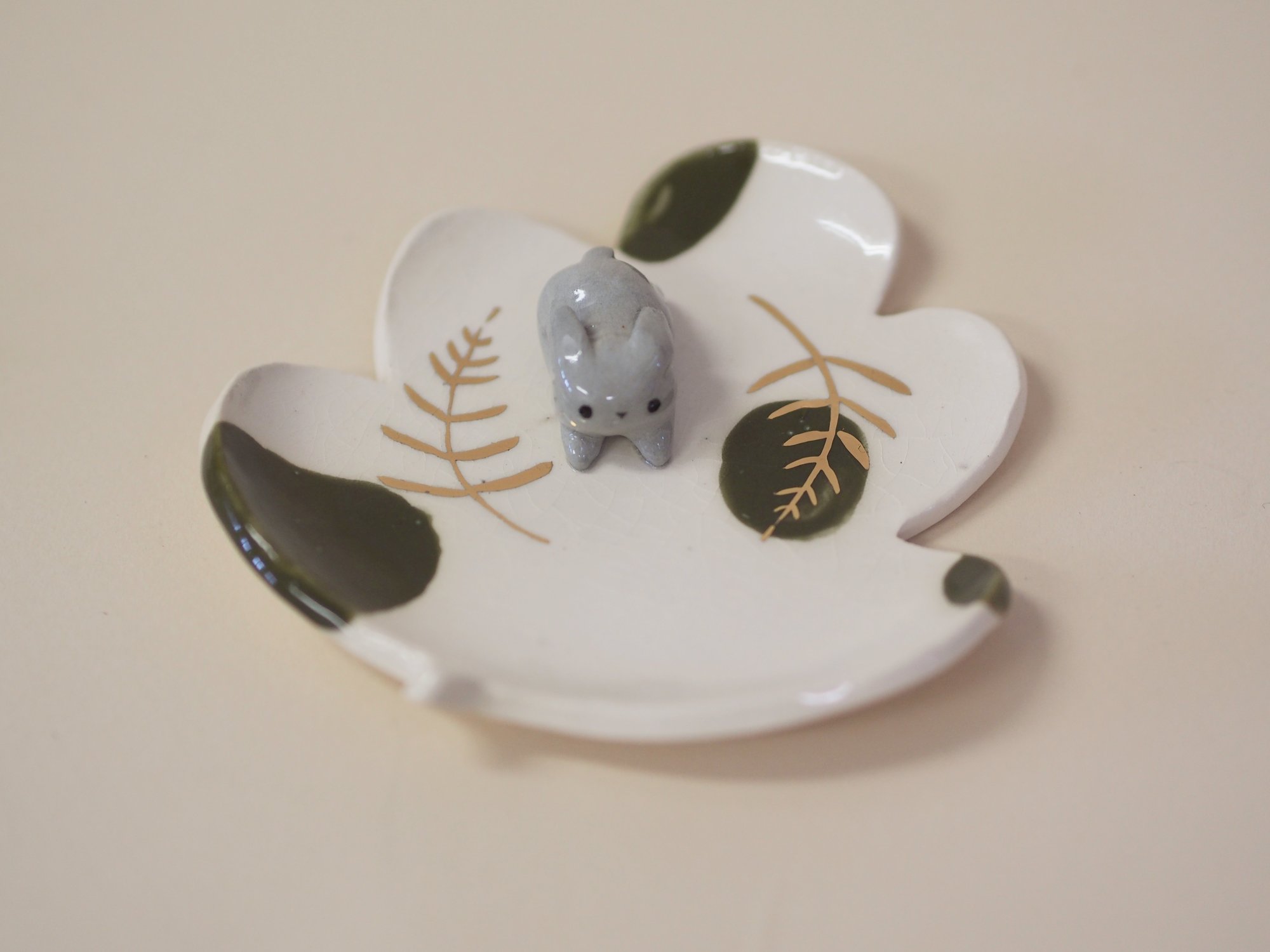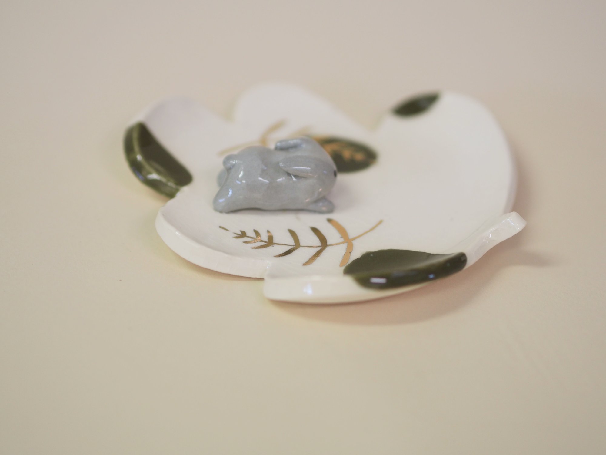 Little grey bunny on a white porcelain ring dish.