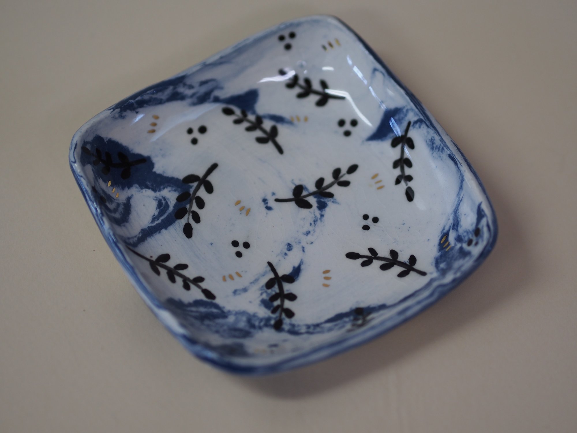 Swirled porcelain ring dish with black underglaze and gold luster. Rings not included.