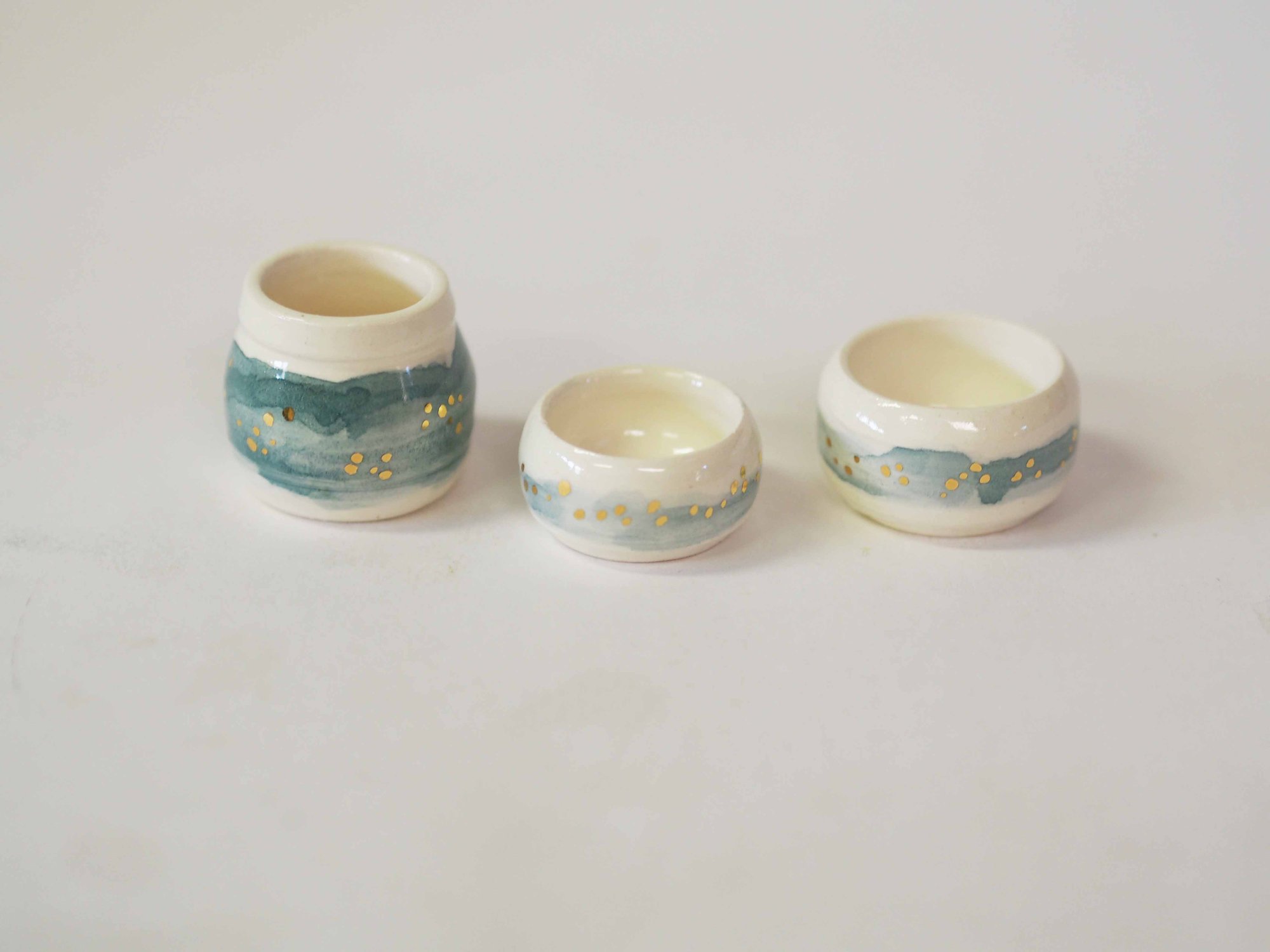 Tiny white porcelain bowls with blue underglaze and gold details. Choose one below.