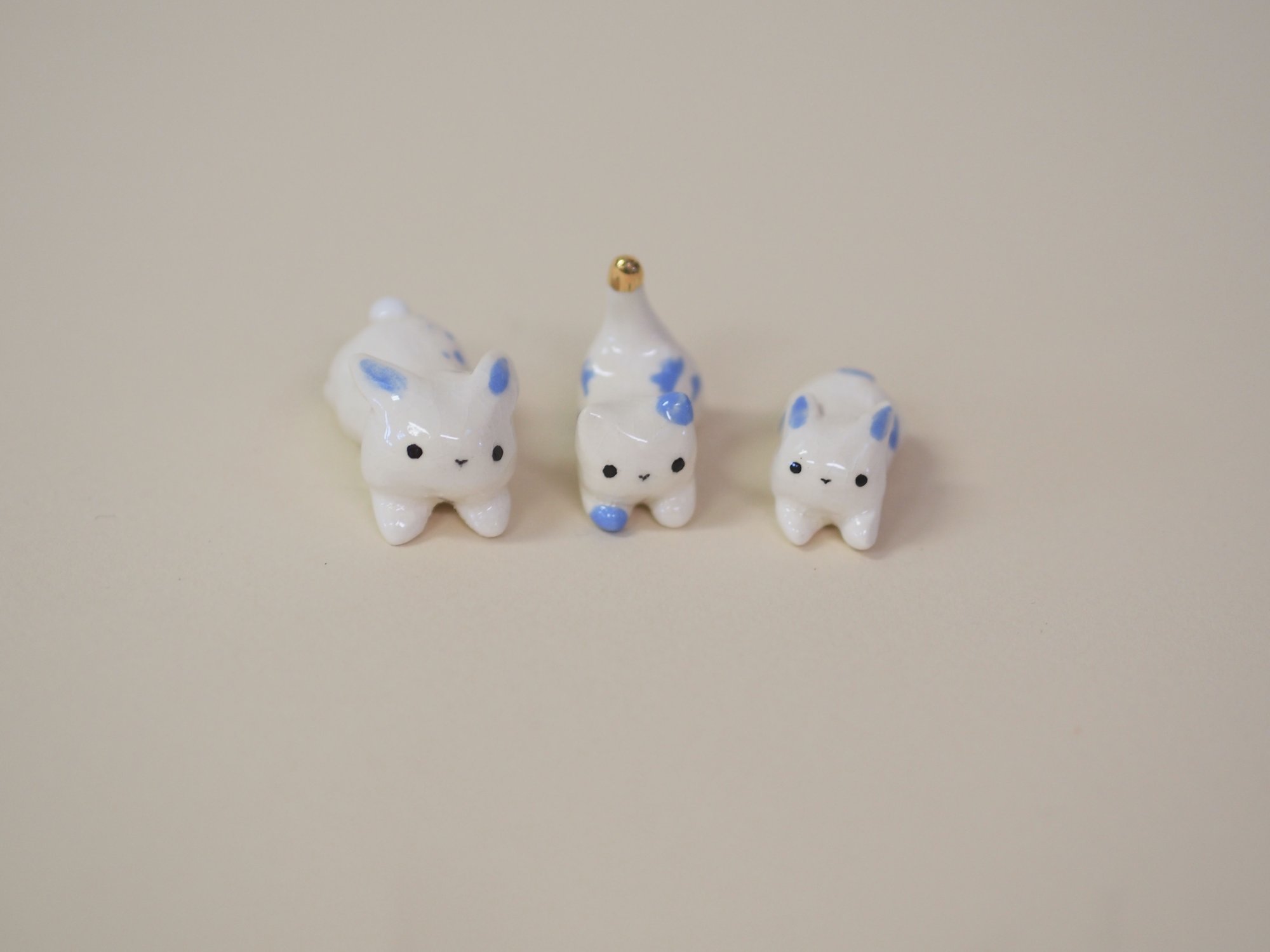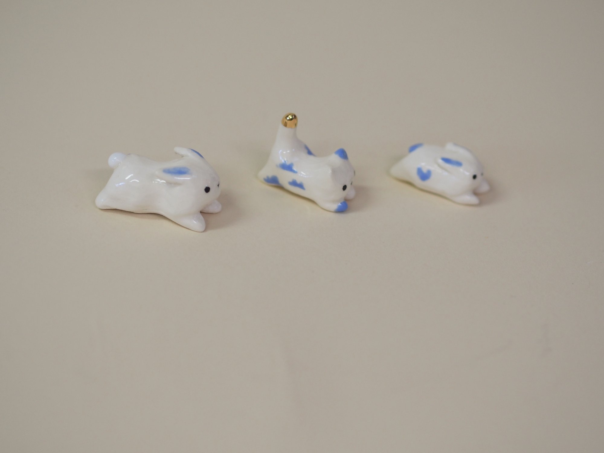 White porcelain stretched out animals with blue underglaze. Choose one below.