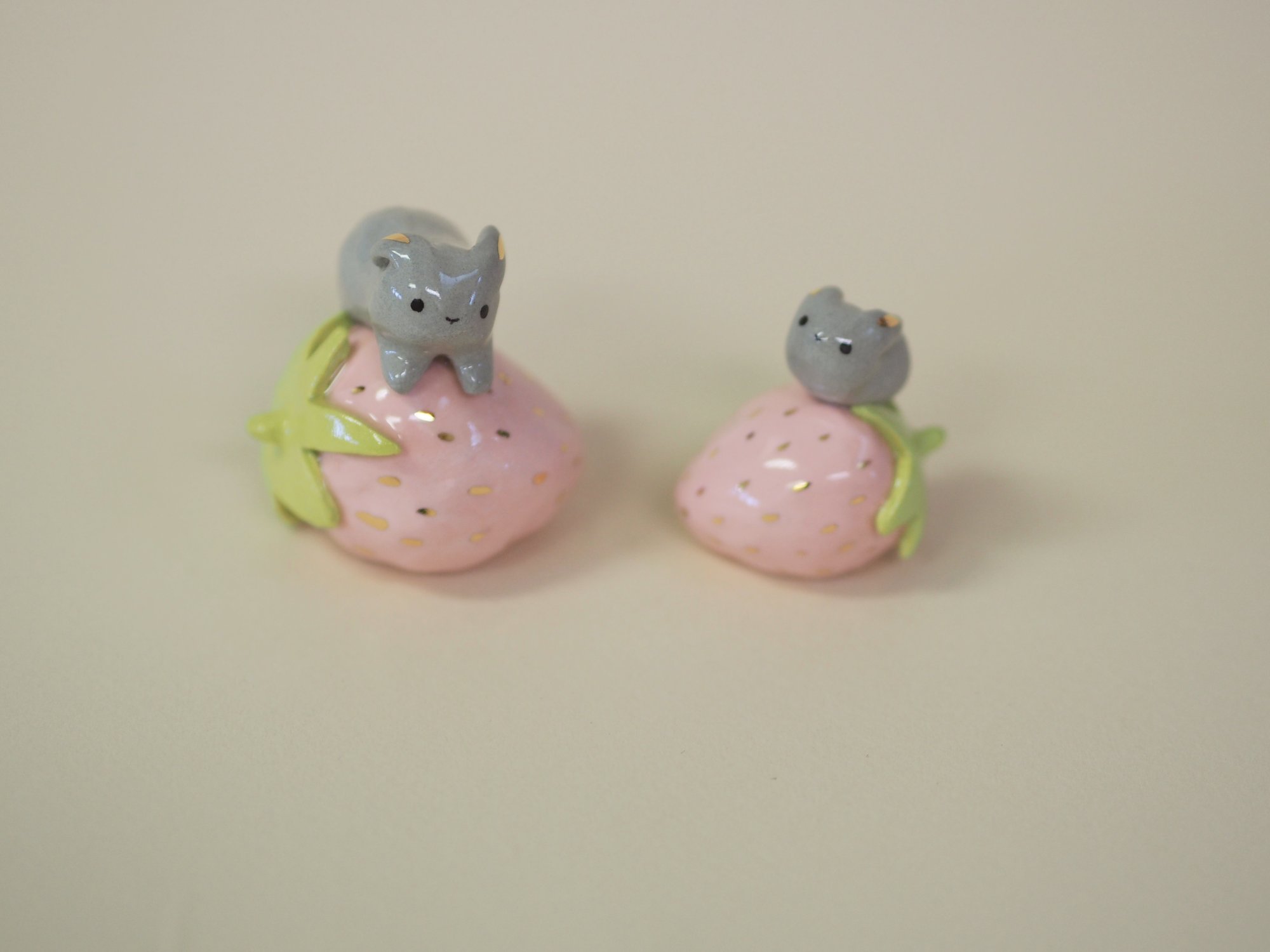 Two little grey bunnies each on a pink porcelain strawberry, both with gold details. Choose one below.