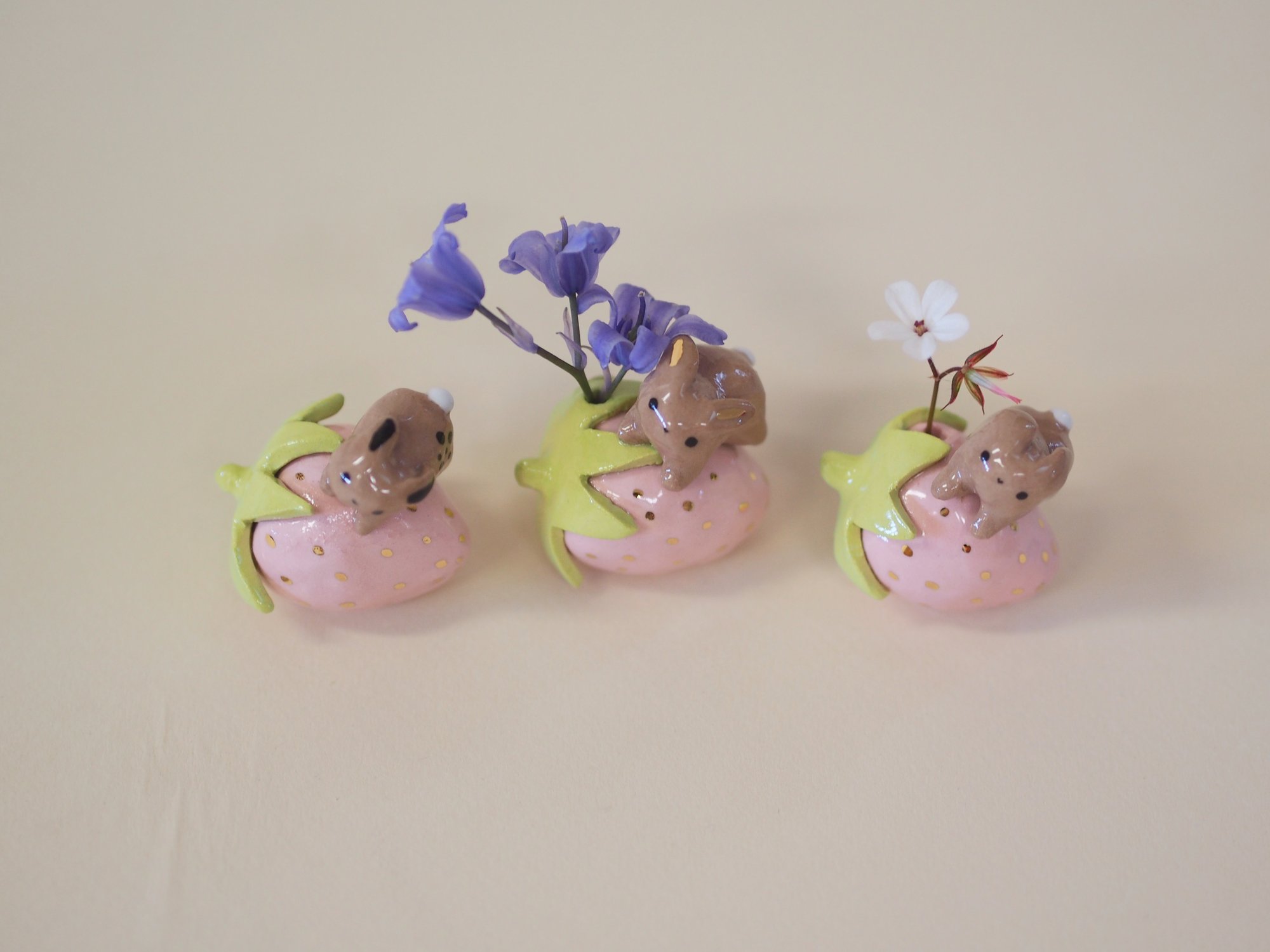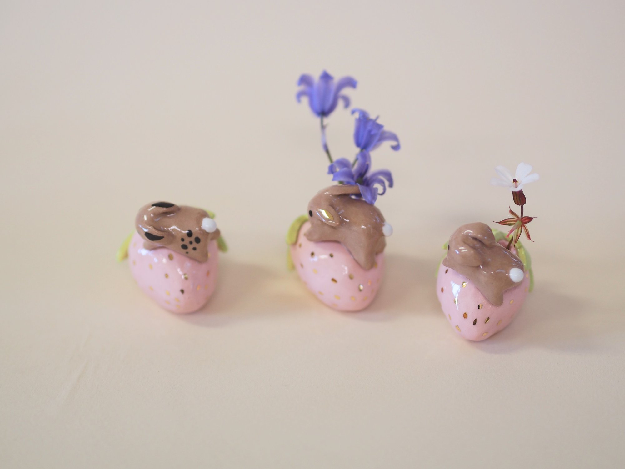 Little brown bunnies each atop a pink strawberry with gold luster seeds. Choose one below.