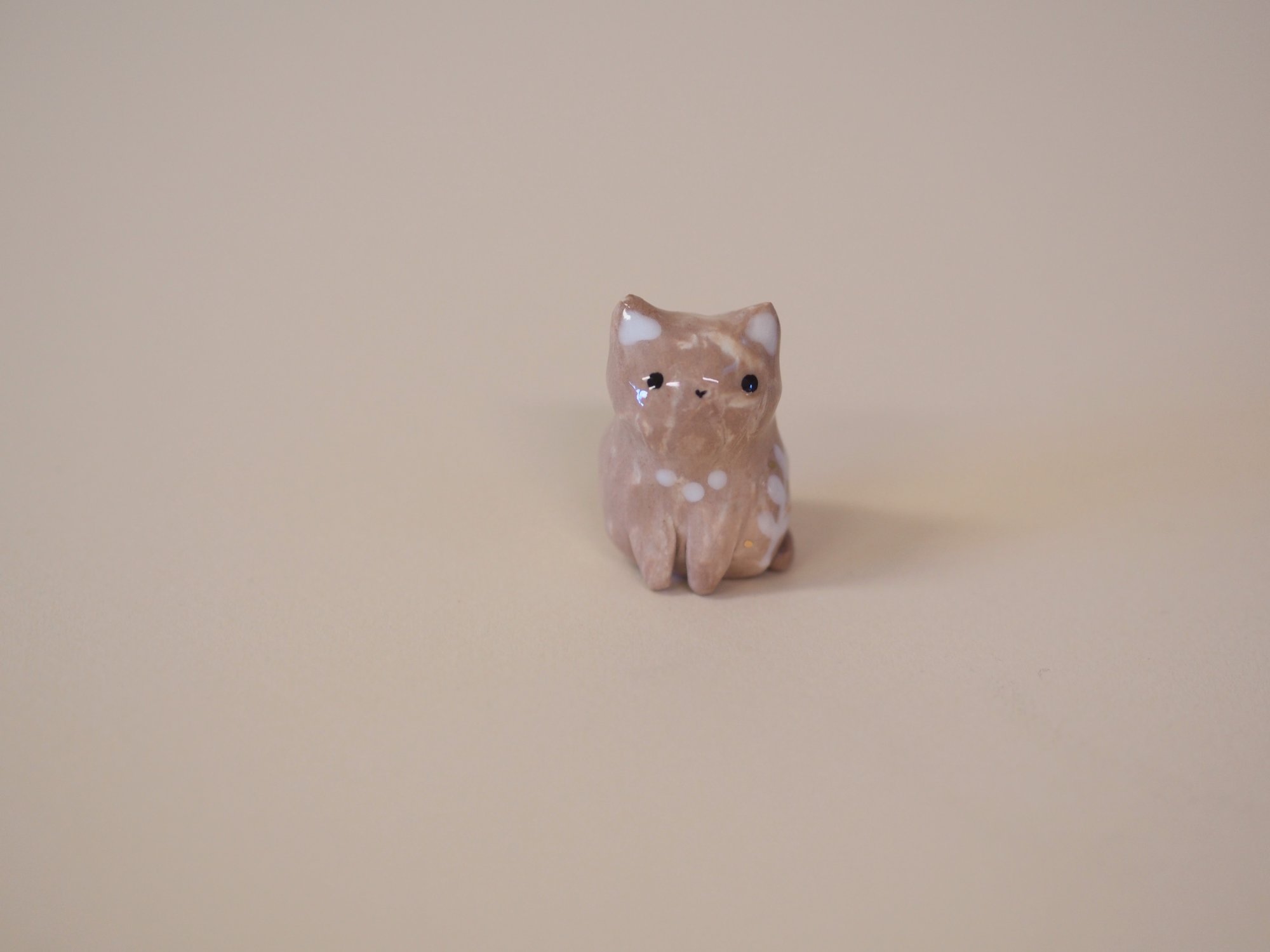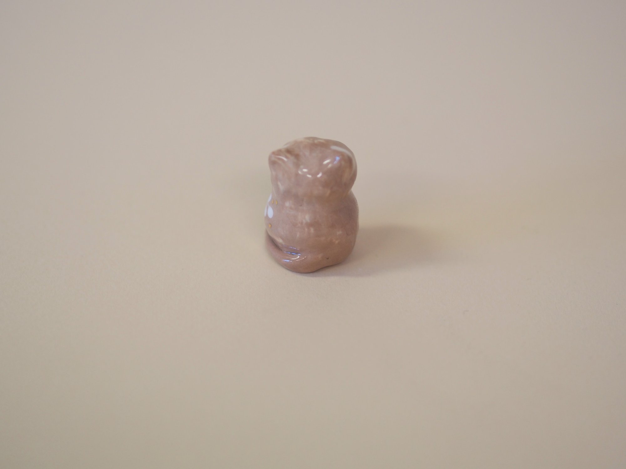 White and chocolate swirled porcelain kitten with white glaze and gold luster details.